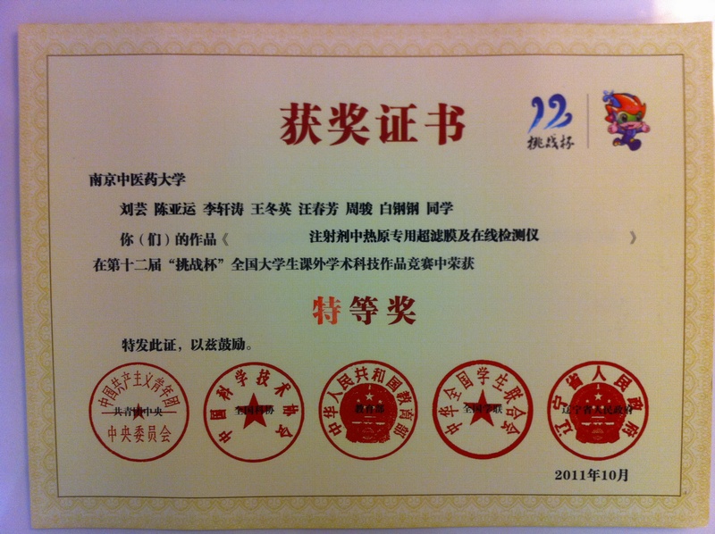 | 特等奖 | 《注射剂中热源专用超滤膜及在线检测仪》 | 刘芸、陈亚运、李轩涛、王冬英、汪春芳、周骏、白钢钢 | 彭国平 | 药学院 |