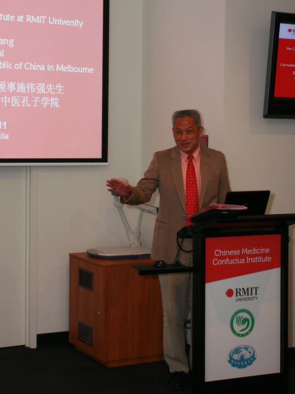 访问结束后,施伟强表示,中医药学凝聚着中华民族几千年的健康养生理念及其实践经验,是中国古代科学的瑰宝。中医药学也深刻体现了中华民族的认知方式和价值取向,是打开中华文明宝库的钥匙。施伟强同时代表中国驻墨尔本总领馆表示,将一如既往地继续支持中医孔子学院在汉语国际教育事业中所做的努力,并勉励大家要充分发挥中医特色,不断满足当地民众对中国语言文化的日益需求。