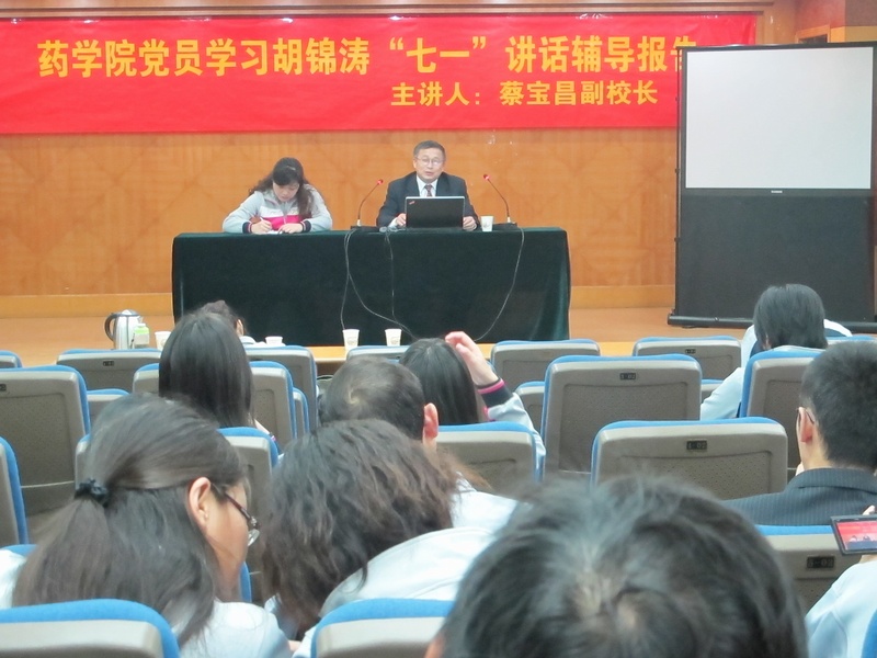 为帮助学院教师更好地了解和掌握胡锦涛总书记七一讲话的历史背景、重大意义和精神实质,促进学习型党组织建设,深入推进创先争优活动,1029日上午,药学院邀请蔡宝昌副校长为全体教职工党员作了学习胡锦涛总书记七一讲话精神辅导报告。药学院院长吴皓、副院长陈建伟、陈蕾参加了报告会。报告会由院党委副书记王珏主持。
