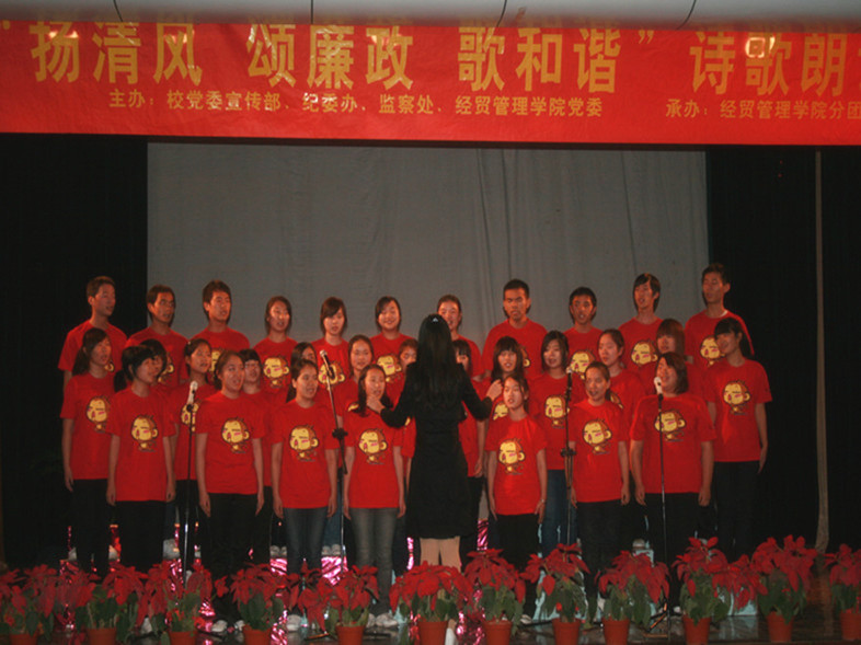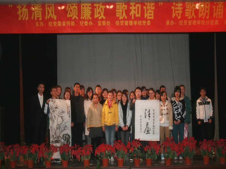 为推动我校反腐倡廉建设深入开展,提高党员干部和广大师生的廉洁意识、积极推进廉洁文化进校园,由校党委宣传部、纪委办、监察处、经贸管理学院党委主办,经贸管理学院分团委、大学生先锋社承办的“扬清风  颂廉政  歌和谐”诗词吟咏会于2011125在大学生活动中心小剧场圆满落下帷幕。