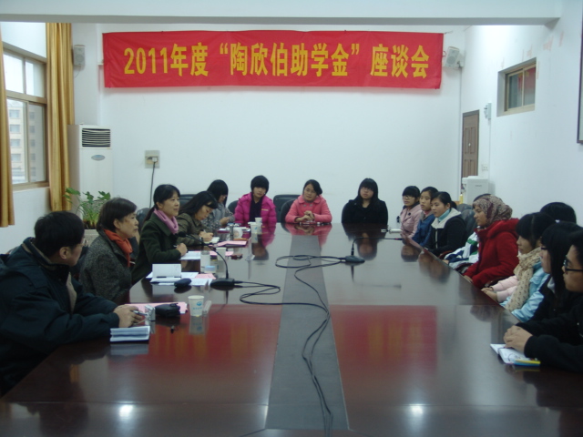 日前,2011年陶欣伯助学金师生座谈会在我校仙林校区大学生活动中心会议室召开。江苏陶欣伯助基金会刘萍秘书长、项目部主任张月红、办公室主任殷民德,我校党委陈涤平副书记、各学院学工书记、辅导员和全体2011年陶欣伯助学金受助学生参加了座谈会。座谈会由学工处屠宏斐副处长主持。