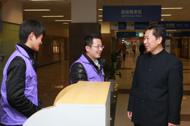 陈涤平副书记和许宏基院长共同为志愿服务基地揭牌,校学生会主席邵刚同学代表志愿者从陈书记手中接过了“明基医院青年志愿服务团”的旗帜。仪式最后,我校青年志愿者们在现场充满激情的进行志愿者宣誓,铿锵有力的誓言将志愿者们全心全意投入志愿服务的坚定信念和决心尽数表达。签字揭牌仪式结束后,与会领导和嘉宾亲切看望了正在岗位上服务的志愿者们。
