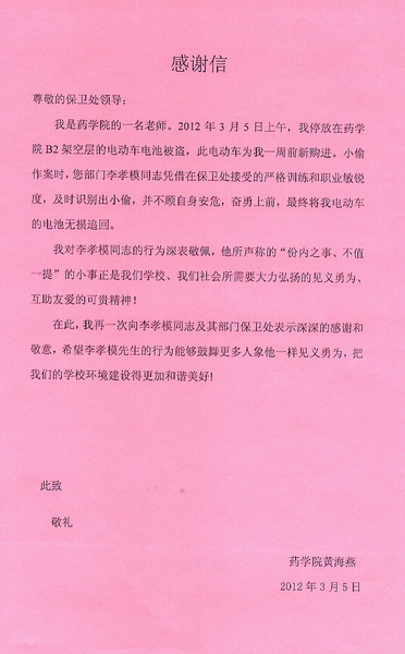 3月5日上午,我校保安队员李孝模在药学院B2架空层巡逻时,及时识别出盗窃电动车电池的嫌疑人两名,他恪尽职守、奋勇上前,最终将被盗电池无损追回。