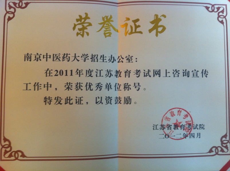 41江苏省教育考试院召开的全省招生宣传工作会议中,我校本专科生招办被评为2011年度江苏教育考试网上咨询宣传工作优秀单位,江苏省共计15所本科院校获此殊荣。