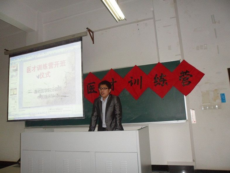 作为基础医学院分团委副书记和此次仪式主持人的商亮同学在学员们的热烈掌声中首先发言。他简单介绍了培训班的培训目的以及前期的准备情况,表示“医才训练营”的开展是为了进一步增强基础医学院学生对医学的兴趣,提高学生的临床技能操作能力、医学综合素质以及义诊活动的有效性和专业性,加强义诊志愿者队伍建设,从而推动基础医学院学风建设进一步发展。他重点强调了培训班的纪律问题,并希望每位学员都能够在培训期间认真上课,主动学习,争取以优异的成绩通过考核。同时他也保证,在培训班结束后将组织多次义诊活动,让考核通过的同学得到锻炼的机会。