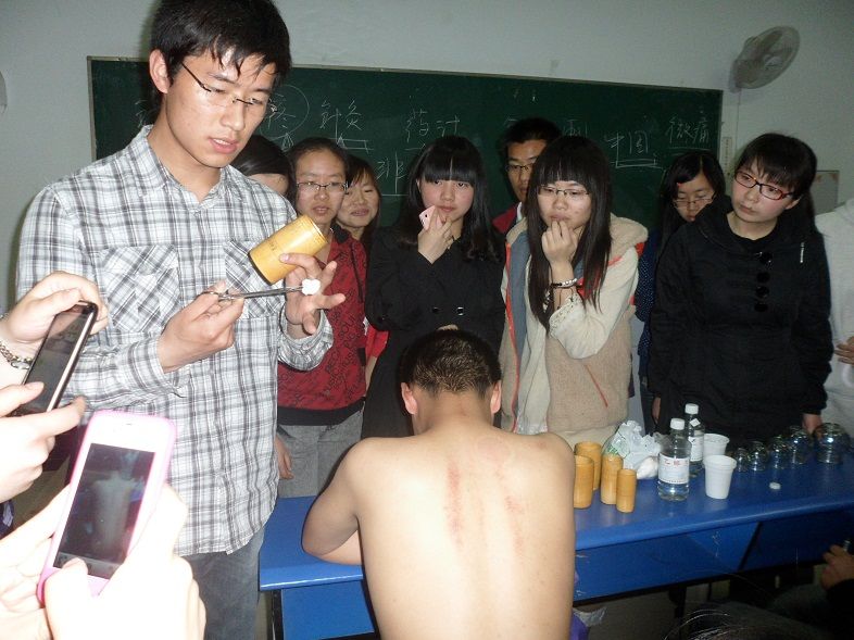 开始培训前,培训老师先给同学们讲解了火罐源远流长的历史、在现代社会的地位、作用机理、主要治疗症状、适应人群、罐斑意义、不同材料火罐区别以及拔火罐的禁忌。在讲解完拔火罐的正确步骤以及注意细节后,老师给同学们分别示范了拔火罐中的留罐法、走罐法、闪罐法、刺血拔罐法、留针拔罐法,同学们看的惊叹不已。示范结束后,培训老师要求每位同学上台动手操作闪罐法,并且给每位同学指出了在操作中的失误以及注意事项。与前几次课相比,本次课同学们更加积极,主动给同学、老师做人模,操作的同学也是积极主动的请培训老师指导、规范自己的手法。