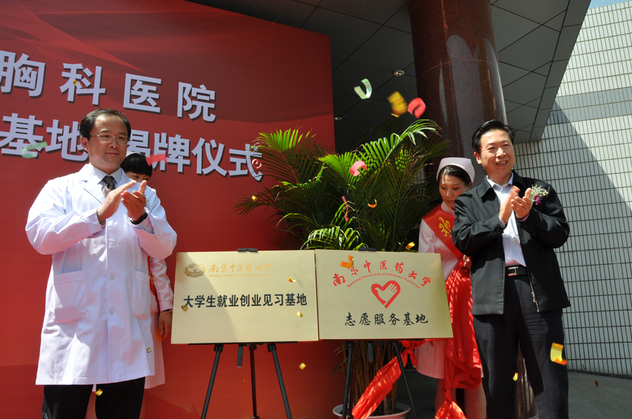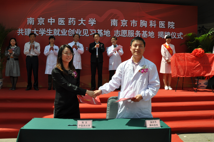 2012427上午,南京中医药大学、南京市胸科医院共建大学生就业创业见习基地、志愿服务基地签约授牌仪式在市胸科医院门诊楼前广场隆重举行。校党委副书记、副校长陈涤平,基础医学院党委书记唐德才、副书记孙新新,校团委副书记杨羽,保卫处副处长齐力,南京市胸科医院院长陈宇宁、党委书记王磊、院团委书记孙扬等领导出席仪式。仪式由南京胸科医院党委书记、副院长王磊主持。学校及市胸科医院相关职能部门、医务人员、大学生志愿者共100多人见证了基地签约揭牌仪式。