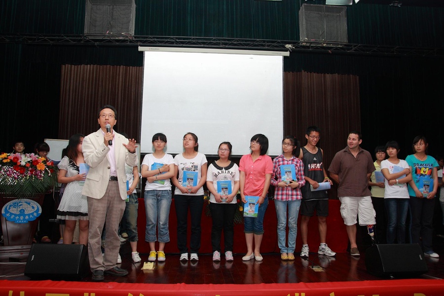 随后王德元先生提出了成功人生的八大问题。现场有十余位同学踊跃参与问题的思考和交流,王先生就同学们的思考和发言进行精彩点评,他希望同学们认真思考自己的答案,好好制定人生规划,朝着自己的梦想努力奋斗。同时王先生告诉全场的师生他们的目标是在全球演讲,宣传绿色地球这一理念,最终的目标是植树两亿棵,当场便有30多位同学举手表示愿意参与这项活动,王德元先生邀请他们上台并赠送Don Elgin先生的《Success is a Choice》励志书籍。
