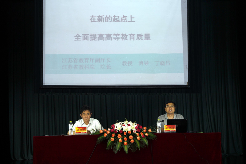 为了贯彻胡总书记在庆祝清华大学百年校庆大会上的重要讲话精神和《国家中长期教育改革和发展规划纲要》,教育部于今年颁布了《关于全面提高高等教育质量的若干意见》(简称“高教三十条”),这是新时期高等教育改革发展的一份纲领性文件。为了帮助我校教职员工领会、把握《意见》的主要内容和深刻内涵,6月5日下午,学校特邀江苏省教育厅副厅长丁晓昌在大学生活动中心小剧场作了题为《在新的起点上全面提高高等教育质量》的专题报告。吴勉华校长主持报告会。