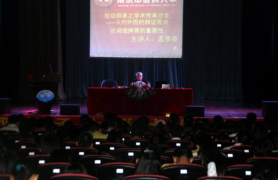 孟老儒雅博学,平易近人,今年已九十高龄,但他依然在耄耋之年关心着中医的学术传承,于百忙之中抽空为校级师承继承人和学生们做学术讲座。讲座期间,孟老仍流露出对学生们的殷殷期望。他谦逊的演讲风度、严谨的治学态度,深深地感动着在场的每一位中医学子。孟老最终以行动实现了他自己诗中的理想——“思邈百岁撰千金,我今九旬尚年轻。未来时日勿虚度,愿将余晖照杏林!”