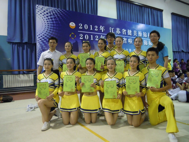 由江苏省健美操运动协会主办的省健美操、啦啦操锦标赛于61-3日在南京体育学院举行,全省共有34只代表队参加了比赛,我校由体育部李志刚主任为领队,在王向晨、夏元庆为教练带领下共参加了六个项目的角逐,获得了五项冠军一项亚军的优异成绩!具体名次如下: