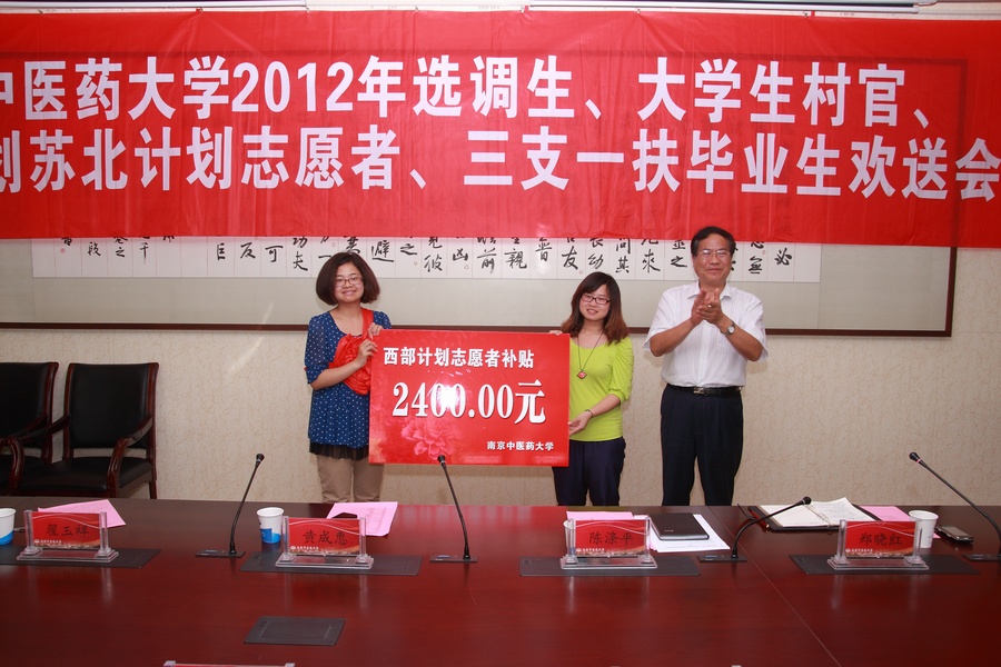 2012620下午4点,在仙林校区行政楼315会议室,我校为20122名选调生、11名大学生村官、2名西部计划志愿者、6名苏北计划志愿者和9名三支一扶毕业生举行了欢送会。校党委黄成惠书记、陈涤平副书记、副校长及组织部、学工处、团委、教务处、第一临床医学院、药学院、经贸管理学院、护理学院、心理学院等职能部门和学院领导、老师出席了欢送会。会议由校团委郑晓红书记主持。