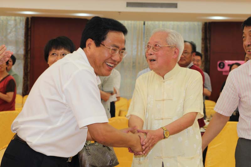 下午五时许,当身着浅黄色绸衣的孟景春教授精神矍铄地出现在祝寿会现场时,大厅内立刻响起一阵热烈的掌声。孟老的同事、老友、学生们争相上前送祝福:“祝您生日快乐”、“祝您活到100岁!”孟老听后像个孩子似的开心地笑了,并与他们一一握手回应。