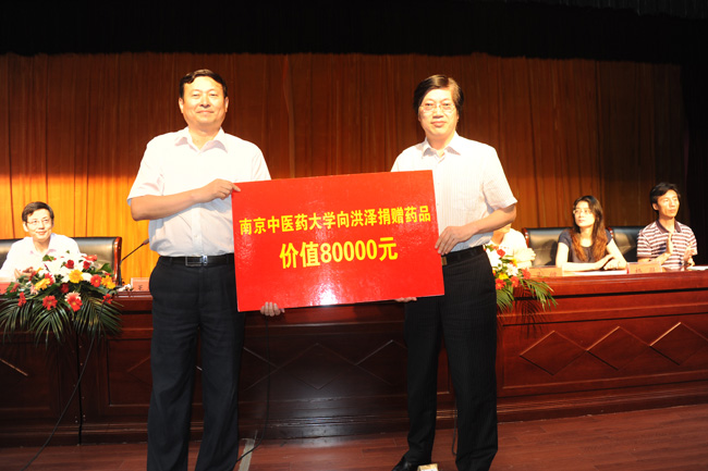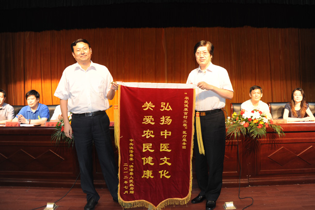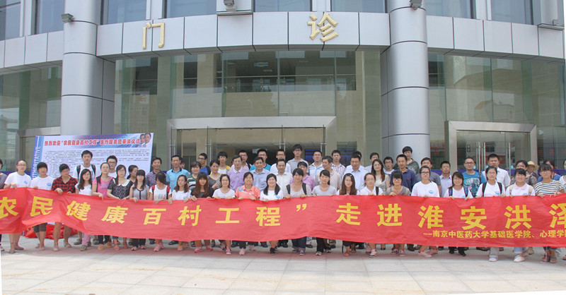 由江苏省红十字会、共青团江苏省委、南京中医药大学和《农民日报》江苏记者站共同主办,中共洪泽县委员会、县人民政府、共青团洪泽县委员会、洪泽县卫生局、洪泽县中医院和洪泽县老干部局和我校团委、基础医学院、心理学院共同承办的“‘农民健康百村工程’走进淮安洪泽”活动于7月7日—9日在洪泽顺利开展。此次活动得到了有关各方的高度重视和大力支持。江苏省红十字会常务副会长潘宗白先生、南京中医药大学党委副书记马家忠教授、洪泽县人民政府副县长王兆龙先生等领导出席了活动启动仪式。启动仪式上,南京中医药大学党委副书记马家忠教授代表学校向洪泽县基层医疗单位捐赠价值8万元的药品,洪泽县王兆龙副县长代表洪泽县向“农民健康百村工程” 基层医疗卫生服务团赠送锦旗。
