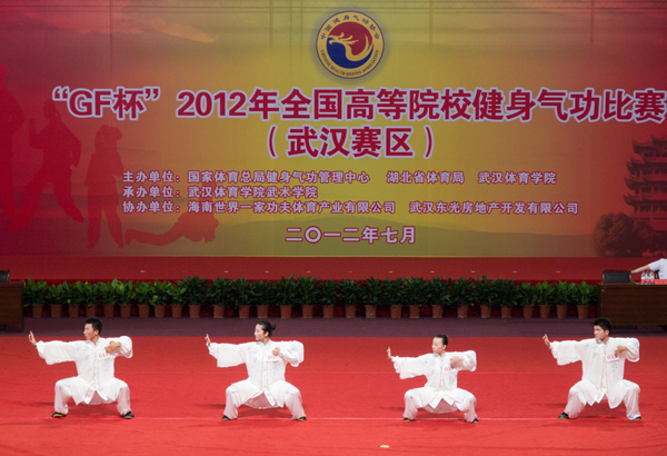 2012年全国高等院校健身气功比赛(武汉赛区)于7月16至17日在武汉体育学院举办,比赛共汇聚了长江以南的37所高等院校共计148名运动员参加。此次比赛项目包括国家体育总局健身气功管理中心编创的四种普及功法和竞赛功法,国家体育总局健身气功管理中心主任冀运希、副主任黄凌海,湖北省体育局副局长林晓华,武汉体育学院副院长孙义良等领导出席了开幕式。