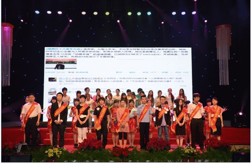 栖霞区2012年十大杰出青年先锋表彰现场,右2为我校马来西亚籍志愿者温子进
