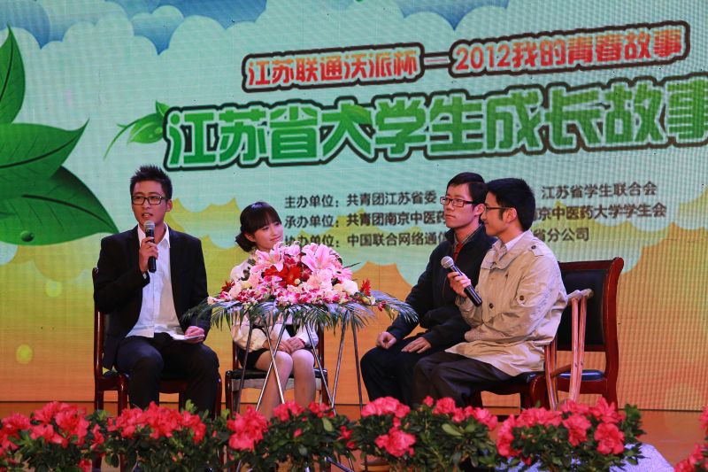 “我的青春我做主,倾听青春的声音”。2012112,由共青团江苏省省委主办,共青团南京中医药大学委员会、南京中医药大学学生会承办的“我的青春故事”江苏省大学生成长故事会在我校大学生活动中心隆重拉开帷幕。南京中医药大学党委陈涤平书记,共青团江苏省少先队总辅导姜东老师,南京中医药大学党委副书记、副校长王长青同志,共青团江苏省委组织部、学校部俞锋部长,江苏省学生联合会、南京大学学生会秦于安主席,江苏省学生联合会执行主席、原南京中医药大学学生会邵刚主席,南京大学团委李浩副书记、南京邮电大学团委张敏副书记、南京特殊教育职业技术学院团委李宏伟书记、薛皓洁副书记、南京中医药大学组织部程革部长、宣传部刘晓部长、团委郑晓红书记、学生工作领导小组的其他各位领导和各院团委书记作为故事会嘉宾出席了活动。南京农业大学、南京师范大学、南京财经大学、南京邮电大学、南京特殊教育职业技术学院等高校学生会主席和副主席、长江小学的老师和学生以及南京中医药大学各个院系的学生们也积极参与到本次活动中。
