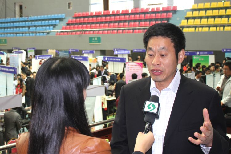 校党委副书记、副校长王长青教授向江苏教育电视台介绍招聘会情况