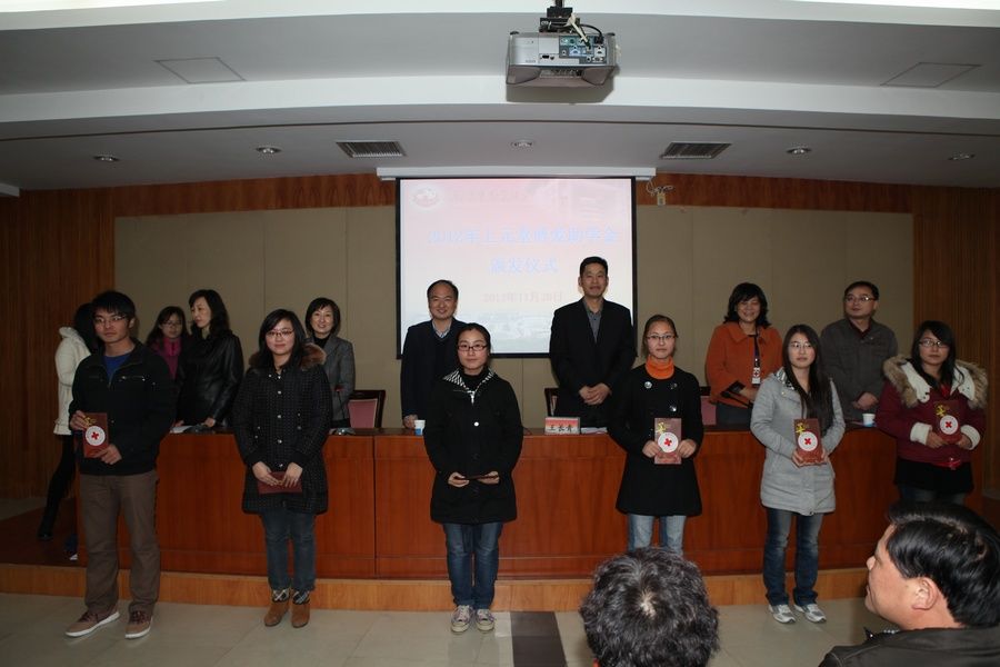 上元堂医药有限公司董事长杨念明先生、江宁区红十字会副会长陈雪女士分别发表讲话。杨董事长首先介绍了公司设立助学金的初衷,表示要在目前每年20余万助学金的基础上,明年将在我校设立高额奖学金,重奖优秀拔尖同学。同时,公司为有兴趣的同学提供网上药店创业平台。杨董事长还勉励同学们要树立信心,勇于实践,与企业共进步。陈雪副会长希望全体受助同学能发扬 “人道、博爱、奉献”的红十字会精神,将自己收获的这份爱心绵延不断地继续传播出去。