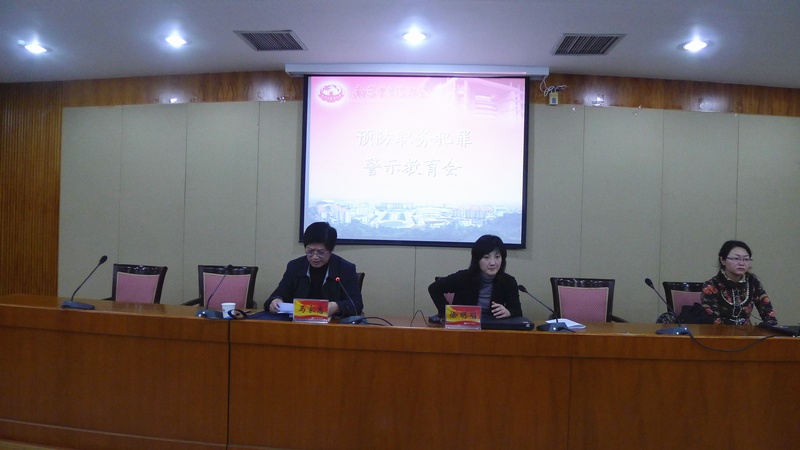徐检察长从当前反腐败工作的总体态势、全省高校发生的职务犯罪案件特点、职务犯罪心理演变情况以及高校工作人员防范职务风险的几点建议等四个方面对我校领导干部进行了警示教育,她指出,目前高校职务犯罪主要集中在工程建设、图书采购、后勤服务及招生考试等环节。党员干部预防职务犯罪,一是要培养良知,二是要体验幸福,三是要权衡利弊、保持警惕,四是要克服侥幸心理。