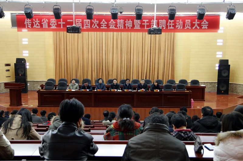12月6日下午,我校传达江苏省委十二届四次会议精神暨干部聘任工作动员部署大会在丰盛楼报告厅举行,传达学习中共江苏省委第十二届四次全体会议上省委书记罗志军同志所作的《认真学习贯彻党的十八大精神,奋力开创江苏科学发展新局面》的讲话精神,并对新一轮干部聘任工作进行动员部署。校领导,党委委员、纪委委员,中层干部,各级人大代表、政协委员,民主党派负责人,副高职称以上专业技术人员,正科级干部,党支部书记共200多人参加了大会。吴勉华校长主持会议。