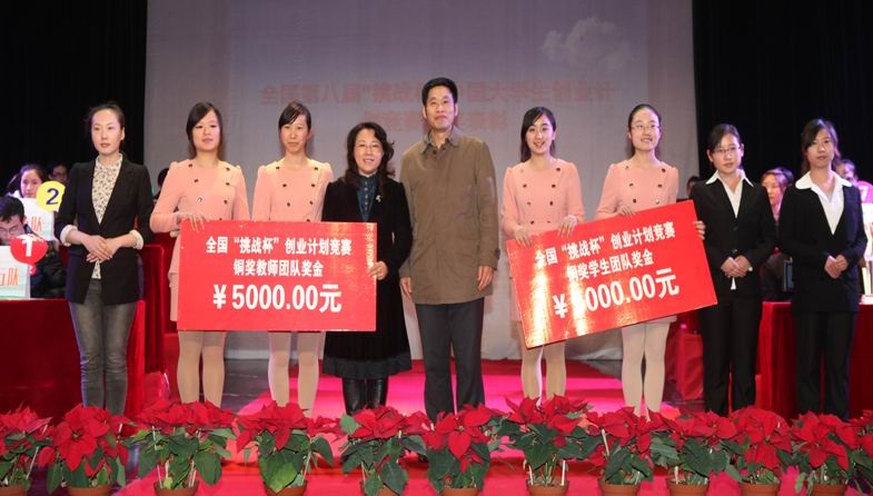 20121129,由共青团中央、中国科协、教育部、全国学联共同主办的在上海同济大学举行的第八届“挑战杯”中国大学生创业计划竞赛终审决赛中,我校《天泽医药科技有限责任公司》创业项目获得金奖及“评委推荐特色奖”、《江苏福瑞祥老年护理服务有限责任公司》创业项目获得铜奖,学校获得“优秀组织奖”,取得我校在“挑战杯”创业计划竞赛历史最好成绩。学校领导充分肯定相关部门和全体参赛师生在挑战杯竞赛中所取得的成绩和付出的努力,对我校作品在“挑战杯”创业计划竞赛中首次斩获金奖,填补了我校参加“挑战杯”中国大学生创业计划竞赛金奖的空白表示由衷的喜悦,希望指导老师和同学们在取得突破成绩的基础上,总结经验,勤勉工作,争取在大学生科技创新工作上取得更大的成绩。校党委陈涤平教授书记、王长青副书记、副校长分别为获得金奖和铜奖的《天泽医药科技有限责任公司》和《江苏福瑞祥老年护理服务有限责任公司》创业项目团队颁发奖状、证书和奖金。