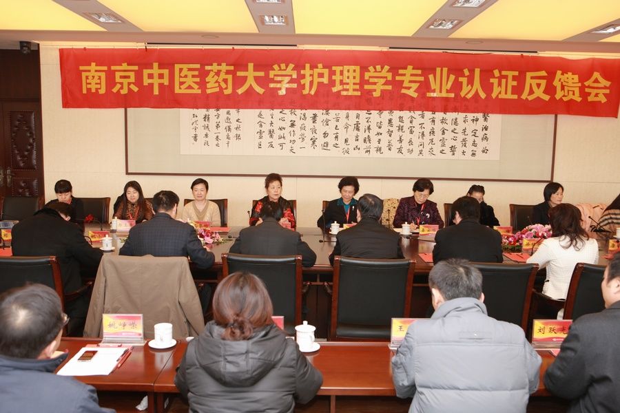 会议首先由郑修霞教授代表专家组反馈初步认证意见。郑修霞教授首先衷心感谢我校领导、各职能部处领导以及护理学院全体师生员工对工作组的支持与服务,尤其深刻地感受到我校对护理学专业发展的高度重视和支持。对我校护理学专业建设情况,专家组给予了充分的肯定,同时对护理学专业今后发展提出建设性的意见和建议。郑秀霞最后指出,南京中医药大学作为国内第一家参加护理学专业认证的中医院校,并以此作为发展学科的契机和动力,对于进一步规范中医院校的办学模式,提高中医院校的护理人才培养质量将起到积极的作用。