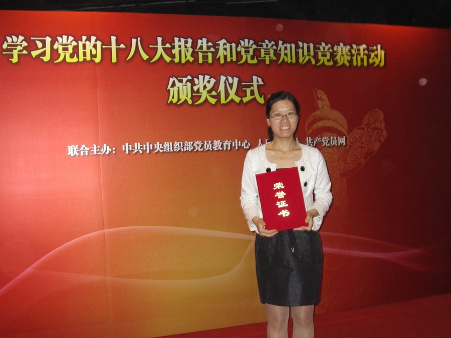5月10日,我校李品品老师赴北京参加中央组织部举办的“学习党的十八大报告和党章知识竞赛活动颁奖仪式”,在此次活动中李品品老师喜获优秀个人奖二等奖殊荣。
