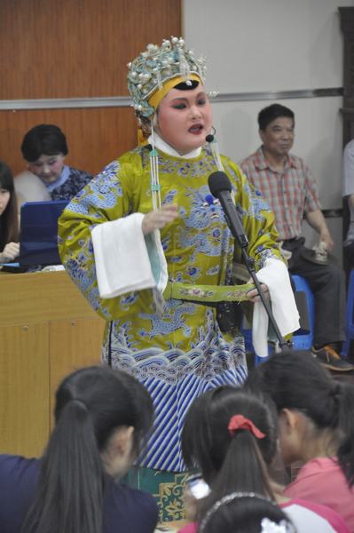 京剧社的同学们向大家深入浅出地介绍了京剧的发展历程,并作了唱段展示,在有限时间内展现了京剧青衣、老生、老旦、花脸、小生多种行当的风采,使得没有接触过京剧的同学对京剧有了直感认识。漂亮的京剧扮相、服装、头饰,让人回味无穷的京剧唱腔,都深深地吸引了小朋友们。京剧社指导老师韩俊鸣老师向大家介绍了京剧的妆容、服装,这些介绍让小朋友们多层次、全方位地了解了京剧、认识了京剧。在现场互动环节,小学生们都争先恐后的上台来参与京剧身段学习互动,充分展现出大家对于京剧艺术的浓厚兴趣。