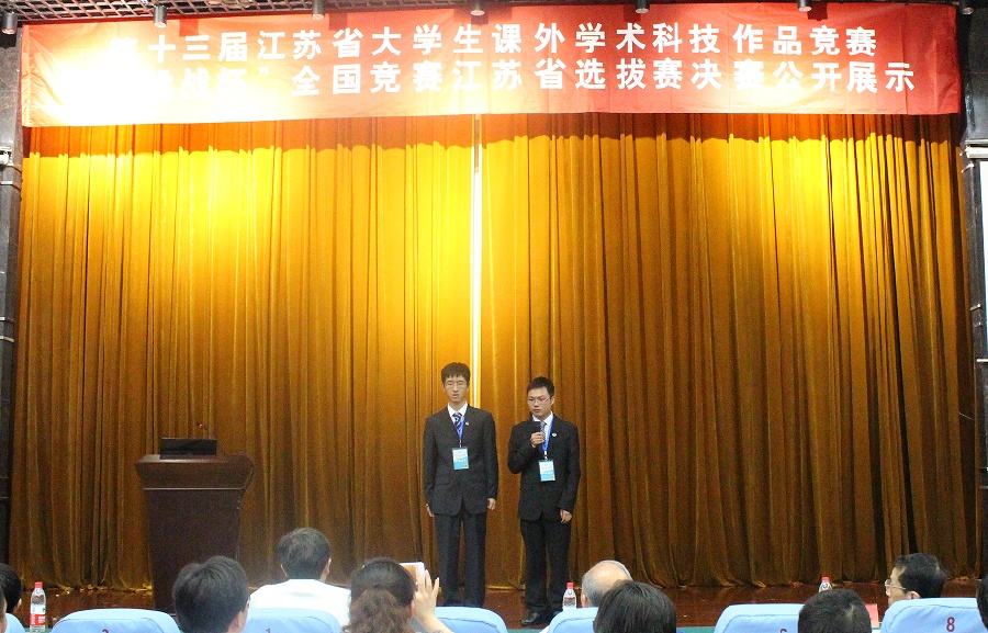 本届“挑战杯”省赛自今年2月启动以来,共收到68所本专科高校申报的参赛作品370件,最终141件作品入围省赛决赛。我校共选送9件作品参与此次竞赛,经过一轮轮评比,我校的5支大学生科技创新团队与省内著名高校代表队同台竞技,由药学院郑仕中教授指导的《姜黄素调控肝脏大麻素受体与血管生成抗肝纤维化新机制研究》被推荐为公开答辩项目(全省4件),团队成员张自力、张涉5分钟陈述,10分钟的精彩问辩,赢得了评委的一致认可。此次江苏省选拔赛,我校共有6件作品被推荐入选国赛。比赛期间,我校第十二届“挑战杯”特等奖作品《注射剂中热原专用超滤膜及在线检测仪》被团省委推荐在江苏省大中小学生科技作品巡礼上公开展示。