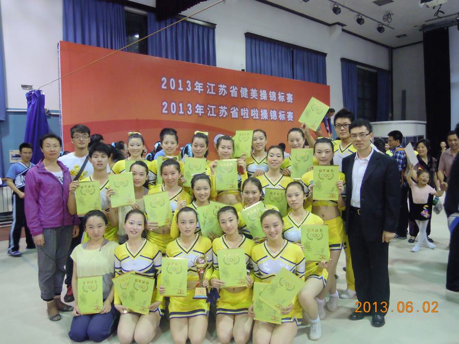 2013年江苏省健美操、啦啦操锦标赛于531-62南京体育学院举办全省共有41支代表队参加了比赛。我校体育部以夏元庆老师为教练的团队共参加了六个项目的角逐,获得了五项冠军一项亚军和团体冠军的优异成绩!