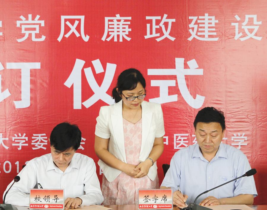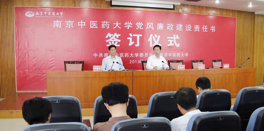 校党委陈涤平书记在签订仪式上作了重要讲话。陈书记指出,学校贯彻党风廉政建设责任制需抓好三个方面工作:一是要抓好学习宣传,强化领导干部政治责任意识。各级领导班子的主要负责人要牢固树立“第一责任人”的意识,当好党风廉政建设责任制的自觉践行者、引领者、组织者、协调者和监督者,将落实党风廉政建设责任制工作纳入学校事业发展的总体布局中统筹谋划;二是要以中央《关于实行党风廉政建设责任制的规定》和《南京中医药大学党风廉政建设责任制实施办法》为准绳,进一步落实责任内容。各级领导班子、领导干部要认真分析查找本部门、本单位、本学院在作风建设和反腐倡廉建设方面存在的突出问题和薄弱环节,进一步完善落实责任制的工作制度,按照“谁主管、谁负责”的原则落实责任分工,健全责任制执行情况报告、述职述廉、督促检查和考核等制度;三是要严格责任追究,保障责任制的贯彻落实。要强化对责任制考核结果的合理运用,考核结束后要及时向被考核单位反馈存在的问题并实行跟踪督促整改,将考核结果送组织部门备案并存入领导干部干部廉政档案,作为干部政绩评定、考核使用、评选评优的重要依据,列入实施党政领导干部问责的重要内容。陈书记强调,落实党风廉政建设责任制是一项长期、艰巨的政治任务,各级党政领导干部一定要在校党委、校行政的正确领导下,进一步解放思想,振奋精神,扎实工作,切实履行“一岗双责”的责任,不断开创党风廉政建设新局面。