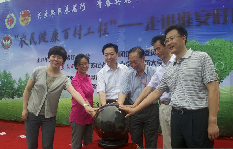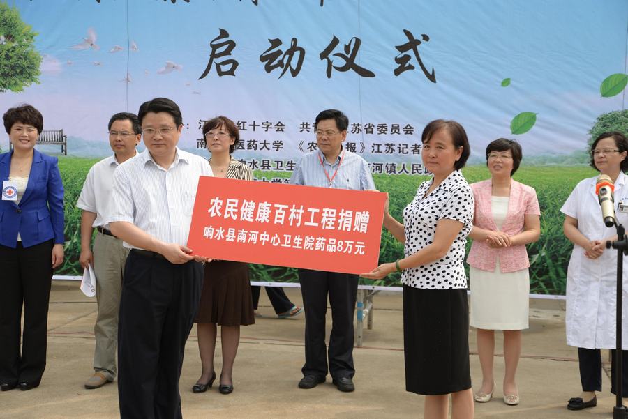 78,以“关爱农民基层行、青春共筑中国梦”为主题的南京中医药大学“农村健康百村工程”大型医疗服务活动分别在淮安市盱眙县中医院和盐城市响水县南河镇中心卫生院正式启动。该项工程由江苏省红十字会、《农民日报》江苏记者站、共青团江苏省委《风流一代》杂志社和南京中医药大学于2007年联合发起,以“关爱农民健康,共建和谐社会”为宗旨开展医疗服务等活动,至今已走过泗阳卢集镇、睢宁邱集镇、安徽五河县、河北景县、河南开封顺河回族区等省内外19个区县,直接服务农民群众62900余人,其中直接医疗服务28316余人,培训基层医护人员870多名,捐赠药品、物资总计66.8万余元,建设基层医疗合作单位8家,志愿者小分队直接深入419个县、乡和行政村149个,投入专家志愿者360余人次及来自中国大陆、台湾、香港、新加坡、泰国、秘鲁、美国、马来西亚、韩国、越南等国家和地区的青年志愿者2100余人次。