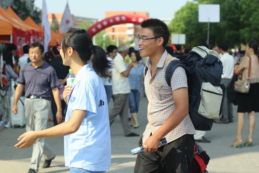 体育馆内开阔的空间、适宜的温度、老师和志愿者们热心的接待,使每一位新生都能够不急不躁、顺利有序地完成报到。来自北京的一名新生在学院接待点报到结束后,按照体育馆内的标志指示同在家长休息区的妈妈会合,由志愿者带领去宿舍放置行李。“原以为今天要忍受南京的大太阳,没想到是在体育馆里进行,有空调有音乐,报到手续比较简单,而且还有志愿者引导,一个人报到完全没问题。”
