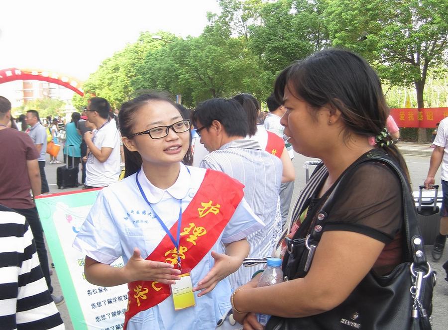 江苏教育电视台记者亲临报到现场,采访了护理学院院长徐桂华教授、学业指导老师金胜姬副教授和新生吴燕君同学,给予本次迎新工作高度评价。