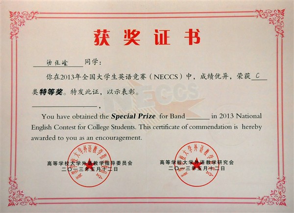 年全国大学生英语竞赛中,荣获C类特等奖。
