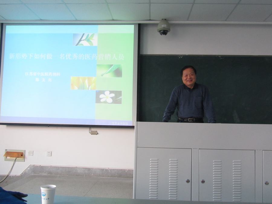 1024下午,先声商学院在B11-212室举办先声论坛系列讲座第十八期第一讲,本次讲座特邀原江苏省中医院药剂科主任陈友亮教授做“如何做一名优秀的药品营销人员”专题讲座。先声商学院徐爱军副院长出席并主持讲座,先声商学院III101班及经贸管理学院营销专业学生参加了此次活动。