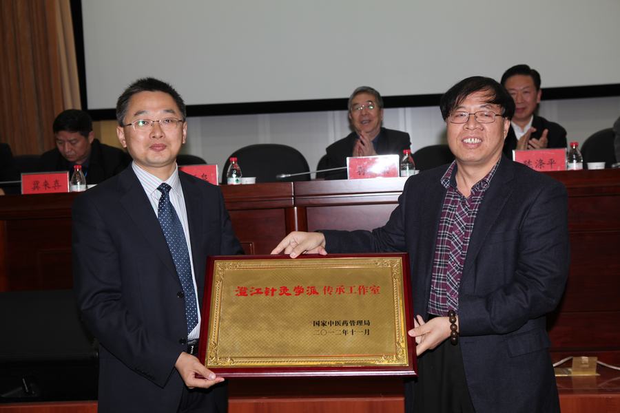 国家中管局中医流派传承基地办公室贺振泉副主任(右一)向南京中医药大学澄江针灸学派传承工作室授牌