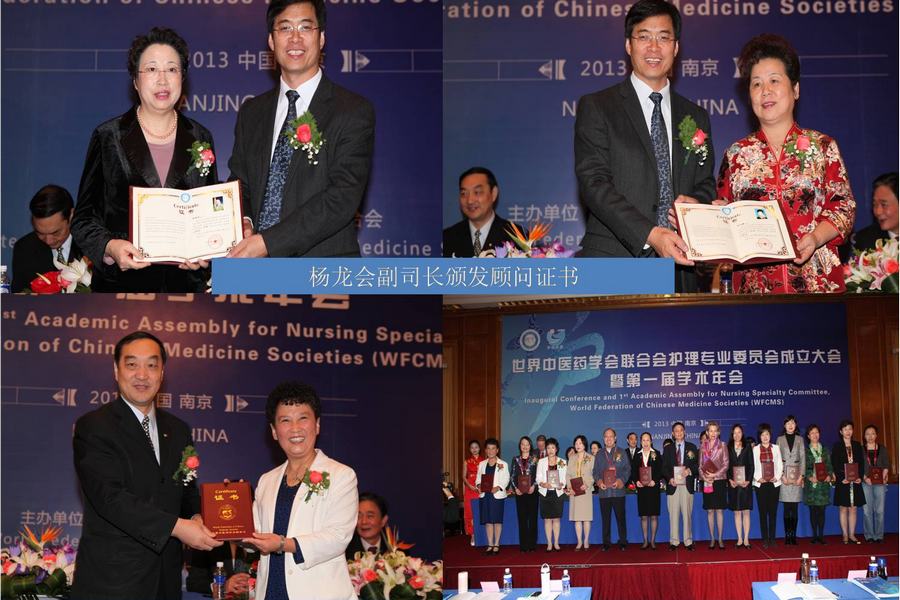 杨龙会副司长颁发顾问证书(上),江苏省卫生厅副厅长、省中医药局局长陈亦江颁发秘书长证书(左下);与会领导共同颁发副会长证书(右下)