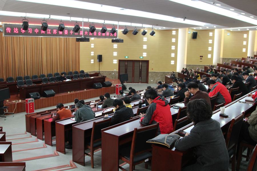 陈涤平书记重点传达了省委十二届六次全会上省委常委会的工作报告和省委罗志军书记在全会闭幕前的讲话精神,全文传达了《中共江苏省委贯彻落实〈中共中央关于全面深化改革若干重大问题的决定〉的意见》(全会讨论稿)12个部分、56条中关于我省全面深化改革的总体目标、主要任务以及加快教育领域综合改革、推进医药卫生体制改革等方面的内容。陈书记要求全校迅速掀起学习宣传贯彻落实十八届三中全会和省委十二届六中全会精神的热潮,认真学习领会关于全面深化改革的中央《决定》和省委《意见》新要求,按照中央和省委的部署要求,扎实有力地推进学校各项事业的改革和发展。