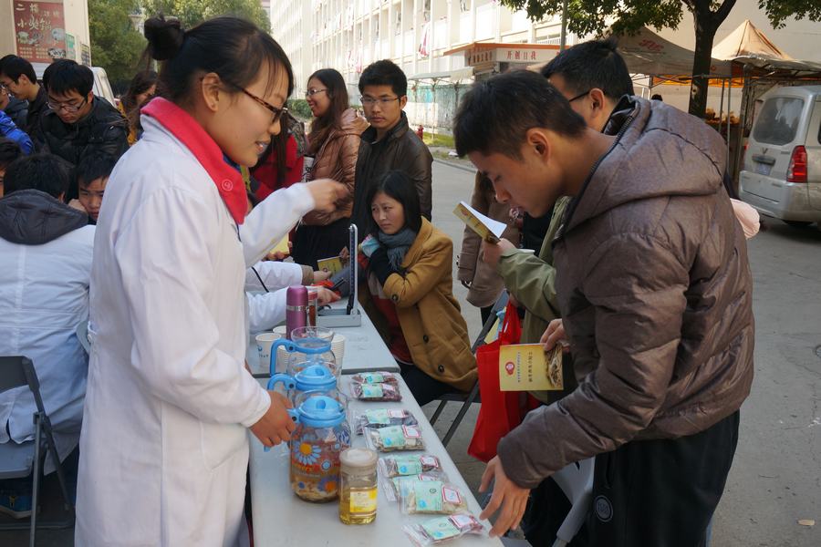 义诊现场热闹而有序,活动内容包括健康咨询、血压测量、针灸、推拿、艾灸、药茶饮用及太极拳表演等。值得一提的是,我校研究生会还专门为本次活动编印了200本《秋冬季养生保健宣传手册》在现场免费发放,并配制了滋阴润肺、美容养颜、温阳补气血功效的药茶,更有大家亲手制作的预防秋冬季流感的中医药香囊,由工作人员现场免费发放给大家,一方面推广了中医文化,一方面也宣传了一些常见病的预防和诊治知识。