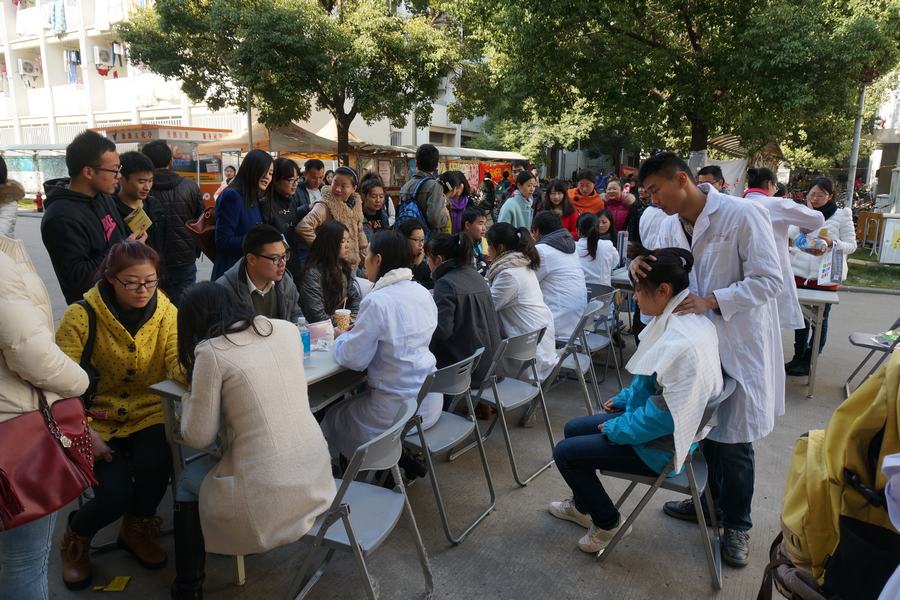 义诊现场热闹而有序,活动内容包括健康咨询、血压测量、针灸、推拿、艾灸、药茶饮用及太极拳表演等。值得一提的是,我校研究生会还专门为本次活动编印了200本《秋冬季养生保健宣传手册》在现场免费发放,并配制了滋阴润肺、美容养颜、温阳补气血功效的药茶,更有大家亲手制作的预防秋冬季流感的中医药香囊,由工作人员现场免费发放给大家,一方面推广了中医文化,一方面也宣传了一些常见病的预防和诊治知识。