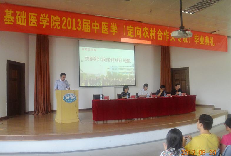 典礼伊始,全体肃立,高唱国歌。基础医学院党委戴慎书记宣读了优秀毕业生名单,主席台领导为优秀毕业生颁发了“优秀毕业生”荣誉证书。优秀毕业生代表李明洋同学发言,表达了对母校深深的眷恋和不舍之情,深深感谢学校与老师三年来的培养和教导。基础医学院马健院长在讲话中对毕业生们提出了殷切的希望,为在座的毕业生提出了四个建议:终身学习,追求真理;遇事淡定,三思后行;心系母校,常怀感恩;扎根基层,服务社会。