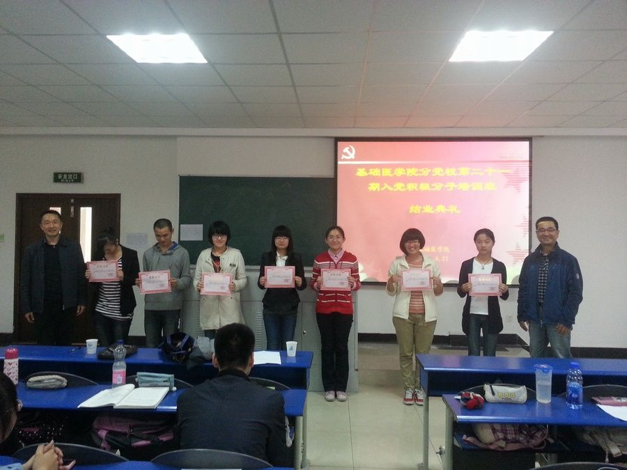 425晚,基础医学院分党校第二十一期入党积极分子培训班结业典礼在B5-201举行。分党委戴慎书记、孙新新副书记、任海燕组织员、基础学工办老师及分党校全体学员参加了典礼。