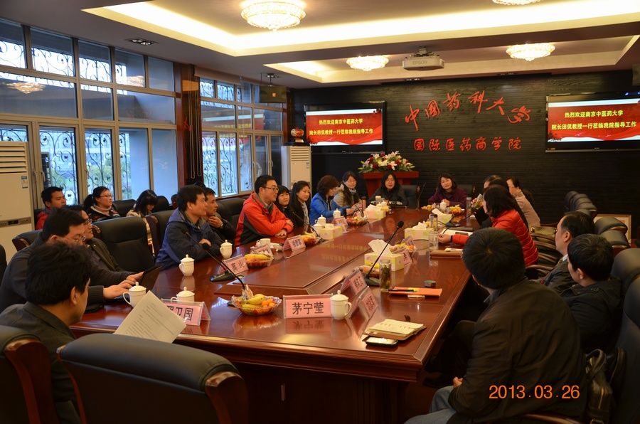326下午,经贸管理学院各系、教研室主任等十余位骨干教师在田侃院长、徐爱军副院长的带领下赴中国药科大学国际医药商学院进行交流学习。