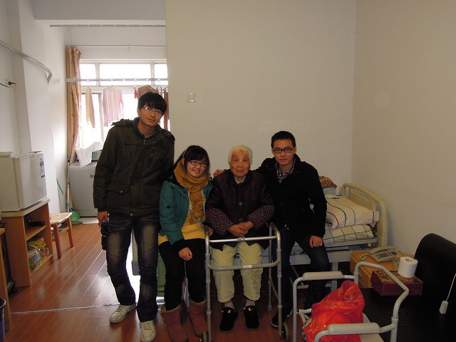 当天,刚走进敬老院,大家就感觉到敬老院环境的整洁和清爽,也许是因为早晨天气不太好的缘故,出来锻炼的老人并不多。到了敬老院里面,大家首先遇到了一位老奶奶,她是退休的老教授,身体很好,而且也很幽默,尤其是当她开门邀请同学进去时说的“come in,please”更是让大家对这些老爷爷老奶奶们多了一份莫名的亲切感。带着这份轻松的心情,同学们分成了小组各自陪伴一位老爷爷或者老奶奶聊起了天。在一些房间中,有成员给老奶奶表演精彩的节目,有成员拉着老人们的手给他们讲着自己丰富多彩的大学生活,大家欢声笑语,温情暖暖。