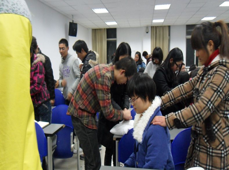 本次培训以练习为主,王老师着重讲解了滚法、揉法、拨法等主要手法的具体操作,包括讲解了定义、要领,并且亲自展示给大家看。如滚法的要领:掌指关节需吸定,前臂带动腕关节使手背特定区域向前滚动。王老师一边讲解一边示范,细致地向同学们展示了推拿的艺术。同学们都专心记笔记,沉浸在学习的氛围中。王老师还讲解了点法、摇法、抖法、拍法、推法、推法和拿法的实施步骤,生动易解的教学使同学们大有所获。历时一个多小时的听讲之后,同学们个个跃跃欲试,迫不及待地与周围同学切磋起来,组成两人小组及时巩固新学习的推拿手法,王老师也融入同学中进行交流,现场好不热闹。