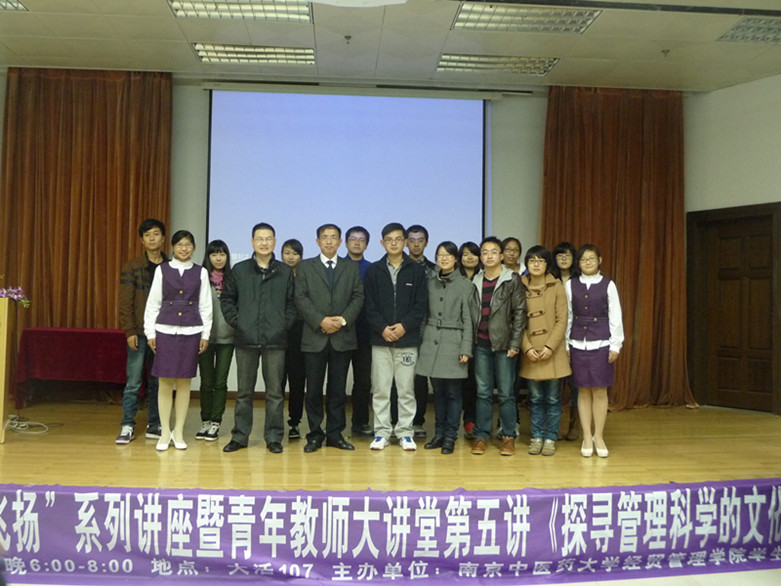 20121122晚,经贸管理学院在大学生活动中心107室成功举办了“我的大学,青春飞扬”系列讲座暨青年教师大讲堂第五讲——探寻管理科学的文化性。本次讲座特别邀请了经贸管理学院工商管理教研室曾智副教授担任主讲人。分团委副书记郑贵宝老师、学工办诸晓老师出席了本次活动。