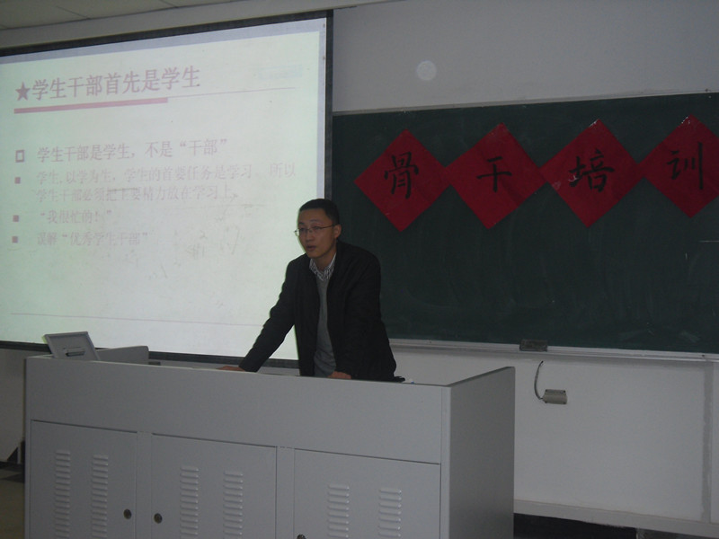 此次骨干培训是针对2012级新生学生干部的两方面问题,即自我定位和工作方法开展的。老师将第一个问题精炼为一句:“按本色做人,按角色做事,按特色定位,到位不缺位,补位不越位”。接着,他通过对学生干部的个人品质提出高要求:有自信、有责任心、有目标、有方法,从而把话题过渡到对工作方法的解说,指出组织团队,为人处世,用人之道,自我完善中细节起着关键作用,并督促学生干部“每日三省吾身”,强调自我省视才能更好的发展。最后,老师希望在座学生通过奋斗,成为拥有学历,能力,阅历的出色学生干部。交流环节中,同学踊跃发言,老师耐心分析,就同学们在工作过程中的疑惑给出了令人豁然的解答。