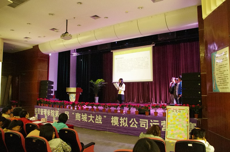 2012114晚,经贸管理学院第一届“商城大战”模拟公司运营大赛决赛于大学生活动中心小剧场拉开序幕。学院学业导师、经贸系金融教研室高丽娜老师,分团委副书记郑贵宝老师,学生会沈爱琴老师以及在挑战杯比赛中多次获得国家级和省级奖项的吴皓学长出席本次活动并担任评委。